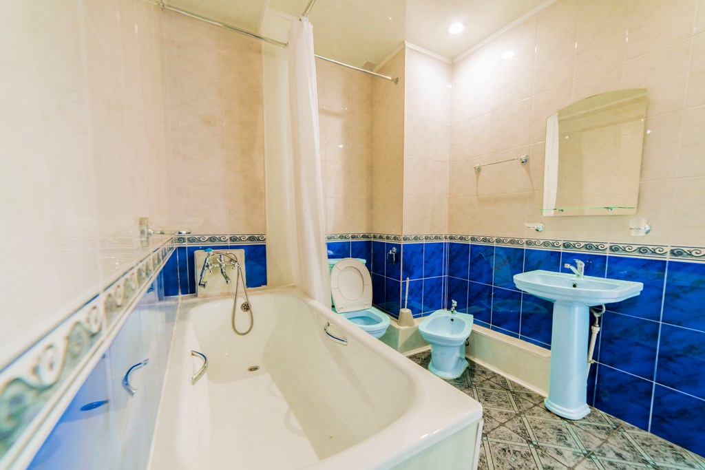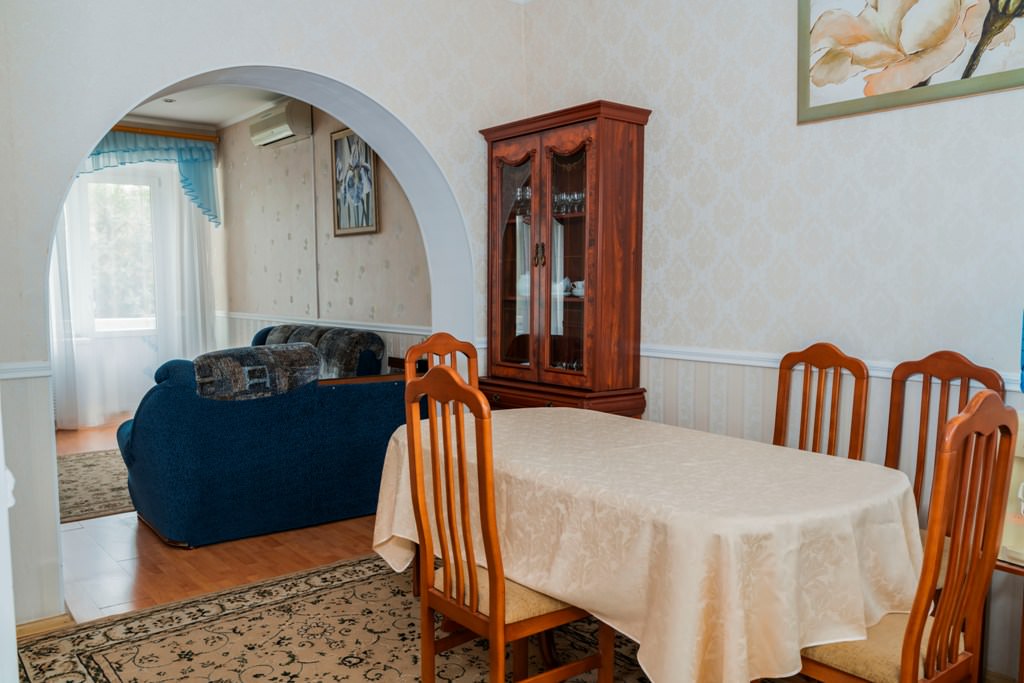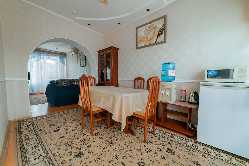 Здесь есть спальня, гостиная, столовая, совмещенный санузел с ванной и биде. Подготовлены тапочки и махровые халаты.