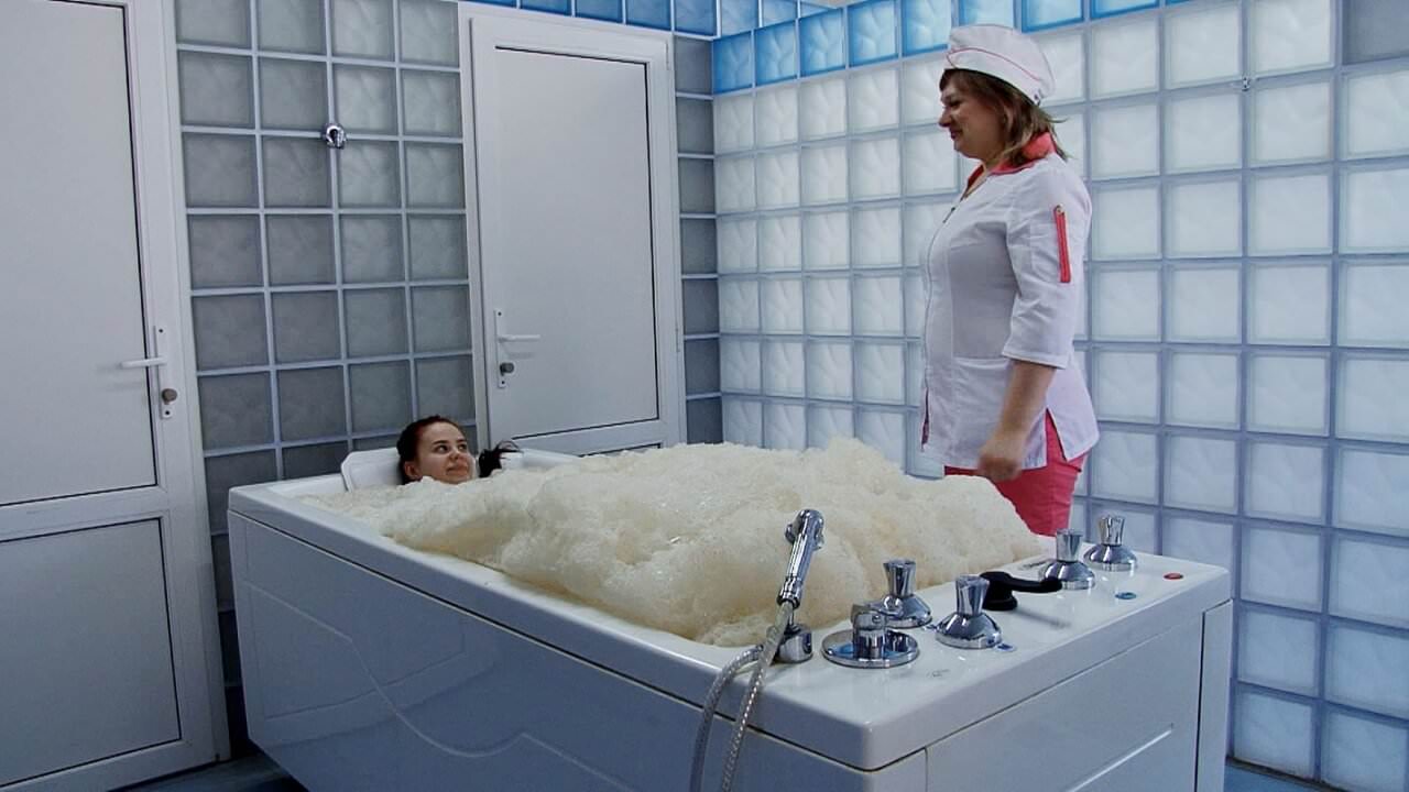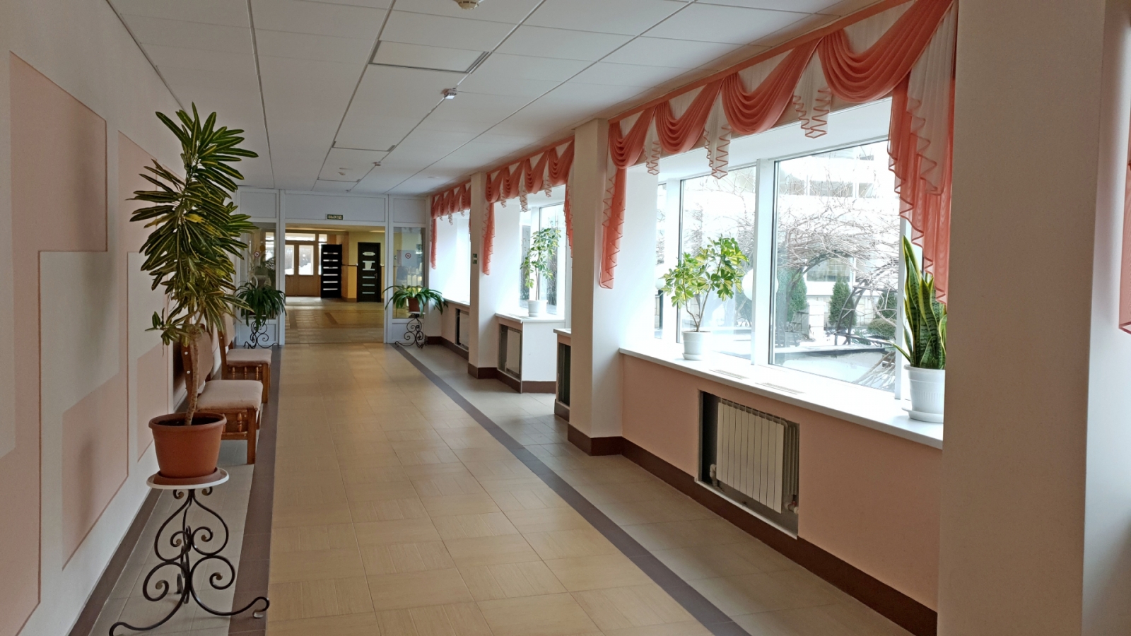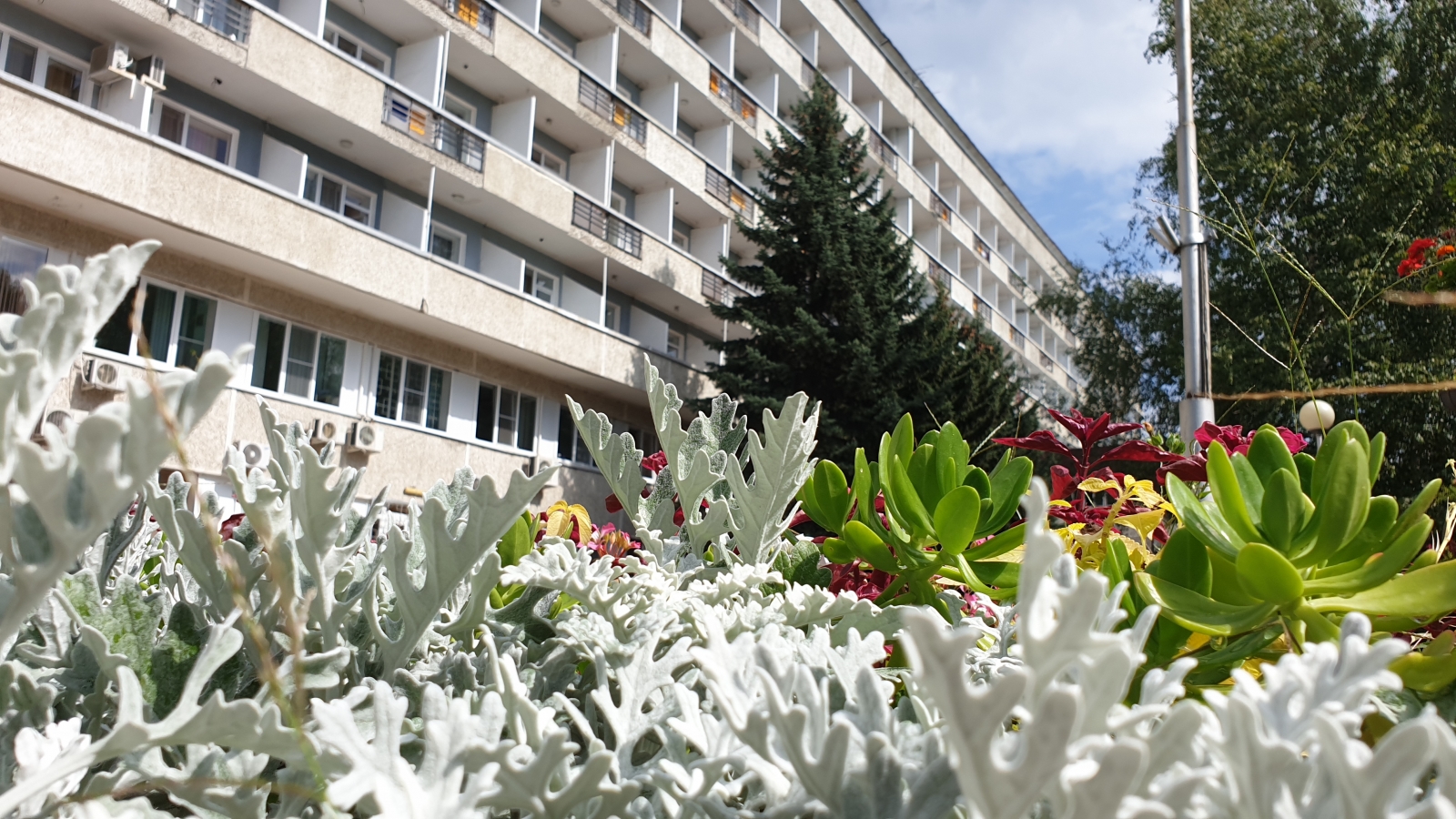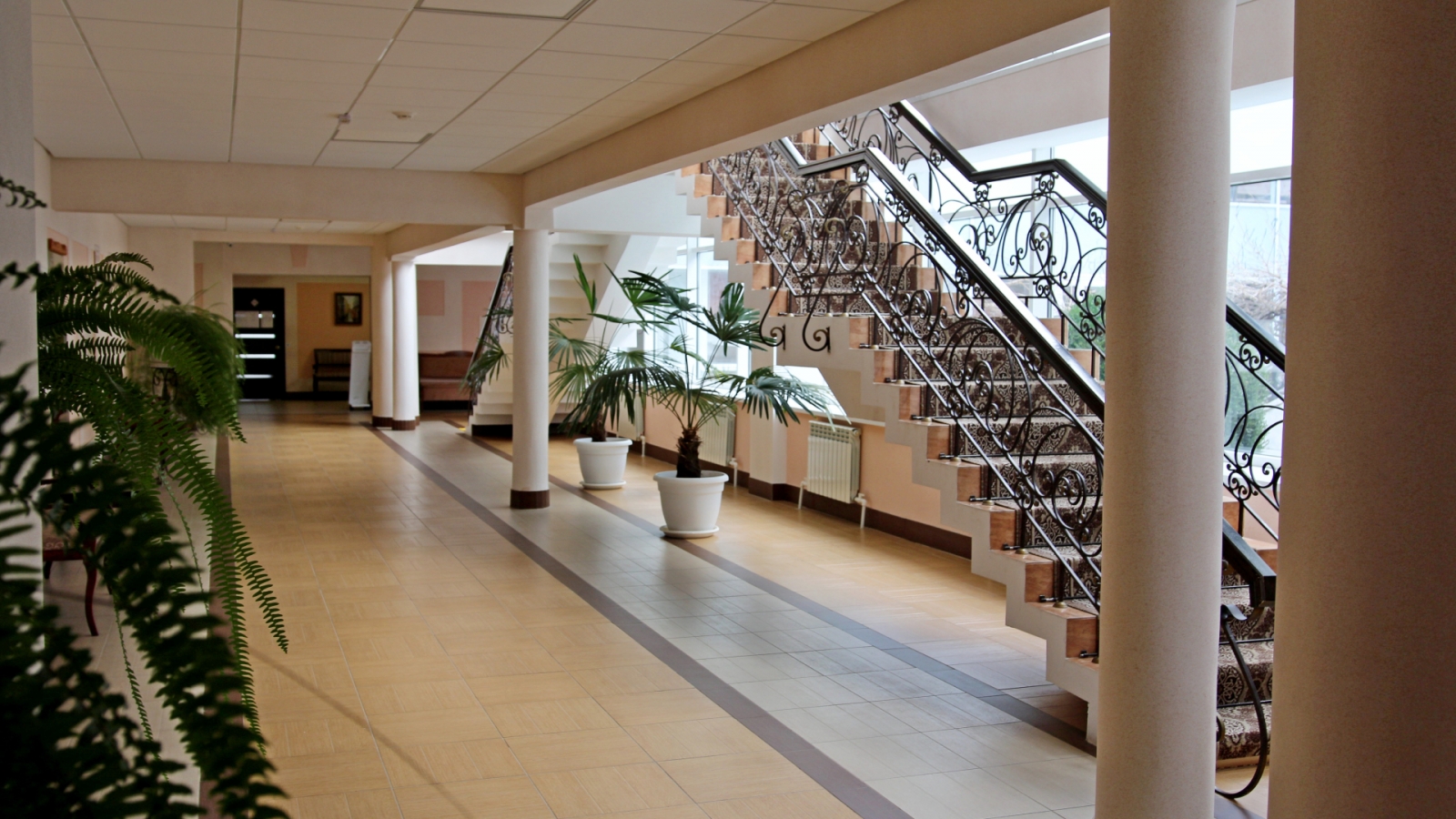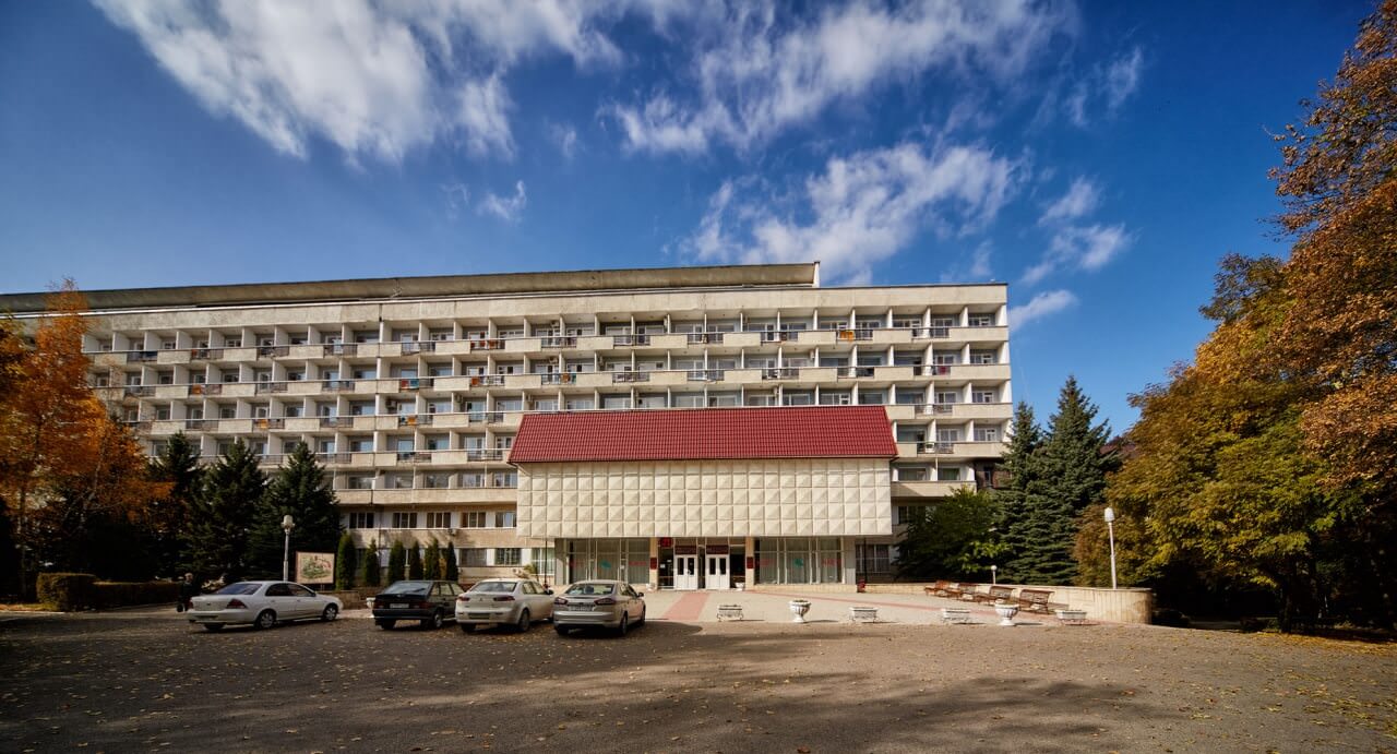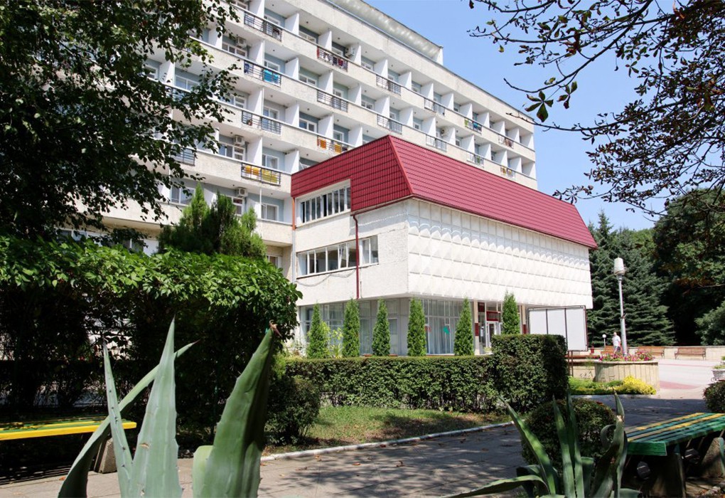В современном 8-этажном корпусе с лифтами, всех административных и медицинских служб, спальных номеров, столовой, клуба, плавательного бассейна, зала лечебной физкультуры, киноконцертного зала на 320 мест.